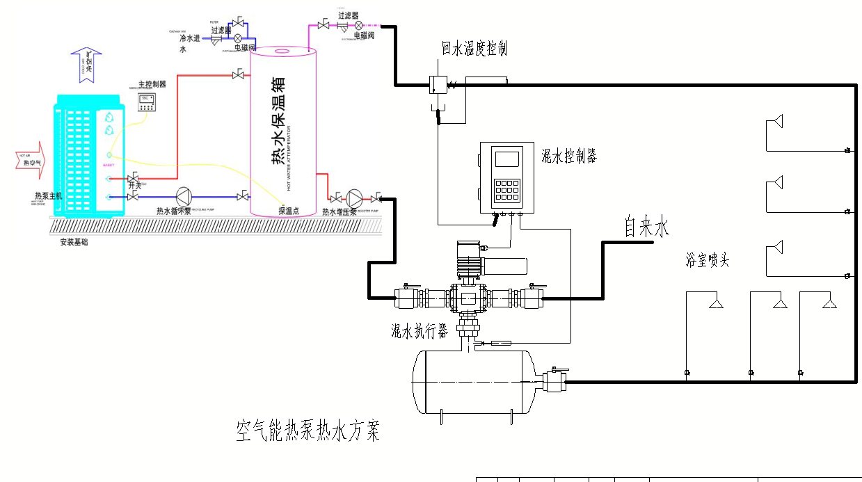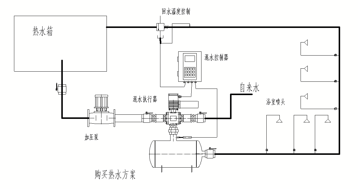 2.采用預(yù)混水方式:這種方法是提前把水混合到40°C左右,需用時通過管道供給,這種方式適用于購買的熱水、小型智能鍋爐或空氣能熱泵,配置一個容量足夠大的熱水箱,然而混水需要增添一部分設(shè)備,如預(yù)混水箱、三通合流閥、水泵、控制箱等,增加了設(shè)備占用空間。