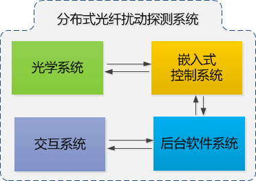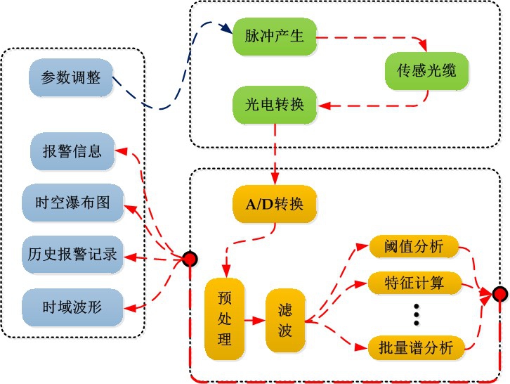 光學(xué)系統(tǒng)產(chǎn)生極窄線寬、功率適當(dāng)?shù)奶綔y(cè)脈沖,將探測(cè)脈沖注入傳感光纖并同時(shí)接收傳感光纖中返回的瑞利后向散射光,進(jìn)行光電轉(zhuǎn)換,提供原始的擾動(dòng)傳感信號(hào)。嵌入式控制系統(tǒng)和后臺(tái)軟件系統(tǒng)對(duì)傳感數(shù)據(jù)進(jìn)行存儲(chǔ)、處理、計(jì)算、傳輸、交互。嵌入式控制系統(tǒng)通過(guò)數(shù)據(jù)采集設(shè)備將光探測(cè)器輸出的模擬擾動(dòng)傳感信號(hào)轉(zhuǎn)換為數(shù)字信號(hào),交付后臺(tái)軟件系統(tǒng)進(jìn)行實(shí)時(shí)處理。后臺(tái)軟件系統(tǒng)讀取傳感數(shù)據(jù)后,進(jìn)行預(yù)處理、濾波、批量 FFT 分析、特征量計(jì)算、閾值分析等,提供擾動(dòng)數(shù)據(jù)的處理結(jié)果。交互系統(tǒng)將后臺(tái)軟件系統(tǒng)的處理結(jié)果實(shí)時(shí)顯示給用戶查看,包括報(bào)警信息、擾動(dòng)曲線、時(shí)域波形、時(shí)空瀑布圖、調(diào)閱歷史報(bào)警記錄、查看歷史波形等功能,并可根據(jù)用戶的輸入,對(duì)系統(tǒng)的空間分辨率、脈沖重復(fù)頻率、探測(cè)脈沖寬度等參數(shù)進(jìn)行適當(dāng)調(diào)整。