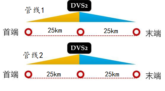 具體,可采用兩套雙通道 DVS 系統(tǒng)從中間向兩邊輻射實(shí)現(xiàn) 50km 的雙管線全覆蓋監(jiān)測(cè)。為降低系統(tǒng)建設(shè)成本,可將兩條管道全部安裝光纖傳感器,兩套傳感器共用一套DVS系統(tǒng),進(jìn)行分時(shí)測(cè)量,即同一時(shí)間只能監(jiān)測(cè)一條管線,管線1和管線2輪流監(jiān)測(cè)。
